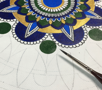 Es dauerte noch eine Zeit bis ich es, zumindest teilweise, verstehen konnte und das kam so: 2016 hatten wir unser Haus komplett saniert, um- und angebaut. Dadurch kam ich zu einem Zimmer in dem ein kleiner Arbeitsplatz ohne irgendetwas Digitalem steht. Der ist nur dem Malen, Basteln oder Werkeln vorbehalten. Kopf an Kopf steht der Arbeitsplatz für den Computer und so konnte ich von nun an, je nach Lust, die Seiten wechseln. Ich hatte mich drei Jahre lang in meiner Freizeit vornehmlich mit dem Bloggen beschäftigt, merkte aber dass ich etwas Neues brauchte. Eines Tages sah ich in Instagram ein persisches Mandala. Das war so wunderschön, dass ich es mir speicherte und immer wieder anschaute. Irgendwann fasste ich den Mut und dachte, dass ich das auch hinbekommen könnte. Ich legte Leinwand, Zirkel, Lineal und Stifte bereit und fing an, mein eigenes Mandala vorzuzeichnen. Nachdem das geschafft war, begann die Arbeit mit dem Pinsel. Ich entdeckte wieder, was ich viele Jahre nicht getan und vermisst hatte. Ich malte, versank in den Prozess und fand die Ruhe in mir selber. Diese Ruhe, könnte ich mir vorstellen, ist das, was ein Ausmaler, abgesehen davon etwas Schönes zu erschaffen, beim Ausmalen findet.