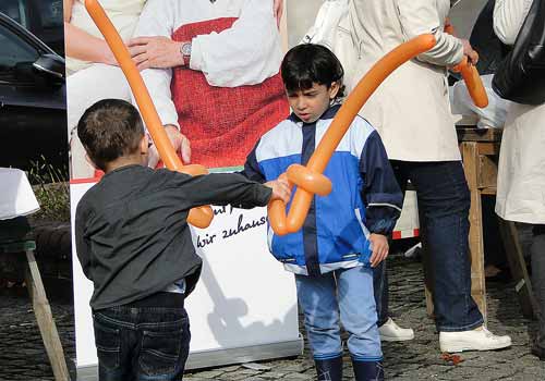 Unterbrochen wurde die Standreihe vom kleinen Pavillon auf dem Ludwig-Beck-Platz. Eigens für diesen Nachmittag öffnete Herr Friedl den Betrieb, so dass alle Besucher eine schöne Tasse Kaffee oder die Kinder ein Eis bekamen. Die JFE Jugendfreizeiteinrichtung Albrecht Dürer und der Schülerclub Memlinge teilten sich einen Stand und boten unter anderem mit Klingeldraht, Riechspiel, Suchtbrille, verschiedene Spiele an und stellten sich allen Fragen zur Einrichtung oder grüßten die vielen Freunde und Bekannten des Hauses, das auf eine lange Tradition im Kiez zurück blicken kann. HiBuDa ist die Abkürzung für die Händlergemeinschaft am Hindenburgdamm. Jeder im Kiez kennt ihre Geschäfte und nutzt sie. Thomas Gralla (Buchhandlung Gralla), Annegret Lenz (Tintenfass und Feder), Detlev Bosse (Eisenwarenhandel Bosse), Jürgen Nastali (Farben, Lacke, Tapeten) und Caroline Sahmel (CS-Haarstudio) setzten ein deutliches Zeichen, dass Kieznähe und Handel unbedingt zusammengehören. Herr Nastali mischte das ganze Fest hin und wieder sehr gekonnt und sympathisch mit seinen Klängen auf der großen Conga auf. Und weiter ging es mit der Paulus-Gemeinde, die unterstützt mit einer netten Bowle die Arbeit der Kirchengemeinde und der Bücherstube vorstellten. Auch an diesem Stand war ein reges Kommen und Gehen zu beobachten – man kennt sich, grüßt sich, unterstützt und freut sich über Gemeinsamkeiten. Den gekonnt orangeroten Abschluss boten die Piraten Partei mit ihrem Stand, der konsequent dekoriert war. Sie hatten den Hit in der Sicht der Kinder zu bieten: Lange orangerote Luftballons, die in Form von Tieren, Blumen und Laserschwertern den Markt in Kinderhänden orange gestalteten. Und so mancher Laserschwert-Kampf wurde ausgefochten, der vielen Erwachsenen ein Lächeln entlockte.