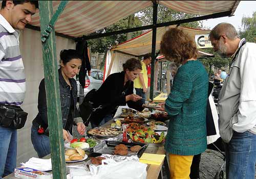 Die bunte Mischung der Stände, die Vielzahl der Besucher und die schöne Atmosphäre des Festes sind besonders zu betonen. Es kam sehr gut an und viele Besucher entdeckten Bezüge zum Kiez, die sie vorher nicht hatten. Auch unter den Teilnehmenden entstand eine Vertrautheit, der Kiez bekam ein Gesicht. Zum Beispiel werden sich Herr Nastali von der HiBuDa und Herr Oesinghaus von ComputerBildung e.V. sicherlich noch lange und fröhlich an ihr gemeinsames Spiel auf der Conga erinnern. Überall saßen die Besucher in Gruppen zusammen, überall fanden Gespräche und Kinderspiel statt. Die jungen Männer aus dem Einwohnerheim hatten Musik mitgebracht und auch kleine Tanzeinlagen trugen zur fröhlichen Stimmung bei. An den Ständen konnte durchgehend ein reges Treiben beobachtet werden. Besonders gefreut hat die Teilnehmenden auch der Besuch von Frau Richter-Kotowski, Bezirksstadträtin für Bildung, Kultur, Sport und Bürgerdienst, die für jeden Stand einen aufmerksamen Blick und nettes Wort hatte.
