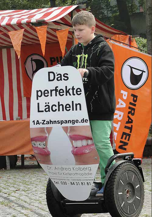 Die Stadtteilgruppe Steglitz-Zehlendorf des ADFC ließ es sich ebenfalls nicht nehmen für ihr Anliegen zu werben. Bei den Treffen der Stadtteilgruppe, die sich jeden ersten Donnerstag im Gutshaus Lichterfelde trifft, sind interessierte Radlerinnen und Radler jederzeit gerne gesehen. Am nächsten Stand wurde es politisch, was so aber nicht ganz stimmt. Die CDU Lichterfelde warb für Bürgernähe und das Bürgerbüro am Hindenburgdamm 80. Christian Goiny und Heiko Köpke standen für Fragen bereit. Besondere Attraktion an dem Stand war an diesem Tag aber das Glücksrad, an dem so manch kleiner Gewinn erdreht werden konnte. Die Kieferorthopädische Praxis Kolberg am Hindenburgdamm 106 konnte so manches zur gesunden Ernährung und Zahnkunde beitragen. Dies natürlich mit Rätseln und Spaß. Unterstützt wurde Andrea Kohlberg durch ihren Mann, Marc Kohlberg, der den Besuchern eine besondere Attraktion bot: Eine Runde auf dem Platz mit einem Segwheel fahren – die beiden Räder mit Lenkstange waren den ganzen Nachmittag im Einsatz. Immer wieder konnte man staunen, wie schnell Interessierte nach einer kleinen Probe auf dem kleinen Gefährt schon eine Runde über den Platz fahren konnten.