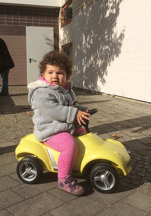 Ein paar Tage später drehte ich nach der Arbeit eine Runde mit dem Auto und holte das erste Bobbycar ab. Quitschgelb und im einwandfreien Zustand. Die Spenderin sagte nur: „Was gibt es schöneres als ein Kinderlachen und wenn sich darüber noch ein Kind freut, wäre ihr das Dank genug.“ Dann brachte ich das kleine Auto in die Einrichtung. Als ich dort ankam, waren eine ganze Gruppe Mütter dort und auch genau das kleine Mädchen, für das dieses Auto gedacht war. Die Kollegin freute sich unheimlich als sie das Auto sah, zeigte es den Müttern und die Schwester des Mädchens setzte sie auf das Bobbycar. Anfängliche Skepsis zeichnete sich im Gesicht des Kindes ab, wandelte sich ganz schnell in die Erkenntnis, dass es sicher und gemütlich sitzen konnte und in Windeseile hatte das Kind verstanden, wie das Auto zu bewegen war. Das Lachen und die Freude des Kindes und der Erwachsenen war meinen Weg wert. Zufrieden und mit einem Lächeln ging ich wieder zum Auto und fuhr nach Hause.