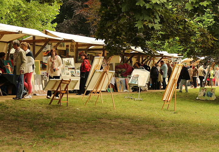 Nun, Basti, dazu hatte ich ja reichlich Gelegenheit. Unter anderem mit den Belegen für die Standgebühr kam ich über den Tag verteilt an jeden Stand des Kunstmarktes. Und nicht nur an die Stände, auch ins Gespräch mit jedem teilnehmenden Künstler. Ungeachtet der sehr netten Gespräche hätte ich gerne mehrere Tage Zeit gehabt, um viel intensiver die Kunst zu bewundern, die sich mir schön dekoriert auf den Ständen anbot. Vornehmlich Bilder in allen Größen und Techniken, Kunsthandwerk von hochwertigen Lederarbeiten, Filzobjekten, Holzskulpturen, Papierobjekten und Schachteln, Papiermaché und Keramik, Schmuck in allen Varianten, Glaskunst … so sehenswert und vielseitig. Wunderbar, was Menschen mit Fantasie, Freude und Kreativität schaffen können. Alle Stände waren schön und bunt anzusehen und so manche Staffelei hat im Schlosspark eine besondere Stimmung gezaubert. Ich war begeistert. Wieder einmal.