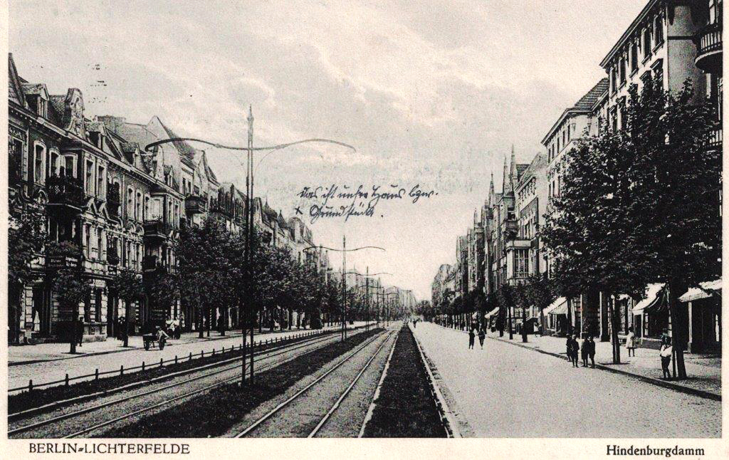 Das Foto zeigt fünf spielende Kinder in einem Haufen von Trümmern, von denen ein umgestürzter Mauerblock als Kartentisch dient. Die Kinder scheinen im Spiel versunken, als ob sie in einem ganz normalen Zimmer an einem Tisch sitzen und das Drumherum keine Rolle spielt. Die Szene könnte in jeder Zeit (seit dem es Spielkarten gibt) in jedem Kinderzimmer ablaufen, nur gab es in der Zeit keine intakten Kinderzimmer, wenn es denn überhaupt Zimmer gab. Der Ort ist die Ecke vom Hindenburgdamm zur Manteuffelstraße in Berlin Lichterfelde. Das ist für mich ebenso berührend, weil wir zwei Querstraßen weiter wohnen. Ich kenne die Ecke seit vielen Jahren. Heute erinnert nichts mehr daran, dass hier einmal alles in Trümmern lag. Wolf Hantschel, der Vater von Beate, ist der Junge ganz links. Er hatte dazu erzählt, dass die Kinder hier Karten spielten als ein Fotograf, Herr Bratke, von der Arbeit nach Hause kam. Als er die Kinder sah, fragte er, ob sie eine kleine Weile warten würden damit er seinen Fotoapparat holen könne um sie zu fotografieren. Wie wir sehen, taten die Kinder das auch. Herr Bratke wohnte damals in der gegenüberliegenden Straßenseite, allerdings war im Internet nichts mehr über ihn zu finden. Wohl aber über den Ort: Ich fragte Wolfgang Holtz, ein Heimathistoriker am Ort, der mit unglaublichen Wissen über die Geschichte des Bezirks immer wieder fasziniert. Aus seinem Archiv bekam ich zwei Bilder. Die eine Postkarte zeigt den Hindenburgdamm 1928 … ich wusste nicht, dass hier einmal eine Straßenbahn fuhr und man sieht die wunderschönen Häuser, die damals die Straße säumten. Die zweite Postkarte, am 14.8.1941 abgestempelt, zeigt genau die gegenüberliegende Ecke des Bildes mit den spielenden Kindern. Hätten die Kinder aufgeschaut, hätten sie die Gaststätte „Alt Lichterfelde“ gesehen, in dem Haus das heute noch dort steht, nur nennt die Gaststätte sich nicht mehr so. Wir gehen gerne dort hin und wieder essen.