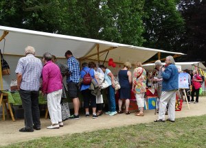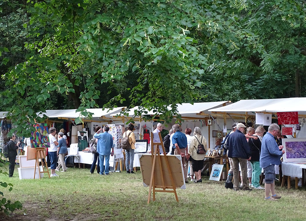 Die Schirmherrin des Kunstmarktes, Bezirksbürgermeisterin Kerstin Richter-Kotowski, bedenkt ebenfalls in ihrer Begrüßungsrede, dass dieser Kunstmarkt schon alle Wetterkapriolen erlebt hat. Dazu wedelt sie leicht mit dem Fächer, den wir ihr vorsorglich und aus letztjähriger Erfahrung vor der Rede geschenkt hatten. Sie lobt die stimmungsvolle Atmosphäre des Parks, der wie geschaffen für einen schönen Kunstmarkt ist, lädt zum Verweilen und Kaufen des abwechslungsreichen Angebots der KünstlerInnen ein, nicht ohne allen Ehrenamtlichen zu danken, die mit uns diesen besonderen Tag möglich machen. Ab dann bestimmt das bunte Treiben den Schlosspark und natürlich freuten wir uns als Veranstalter, dass offensichtlich viele Menschen unserer Einladung gefolgt waren.