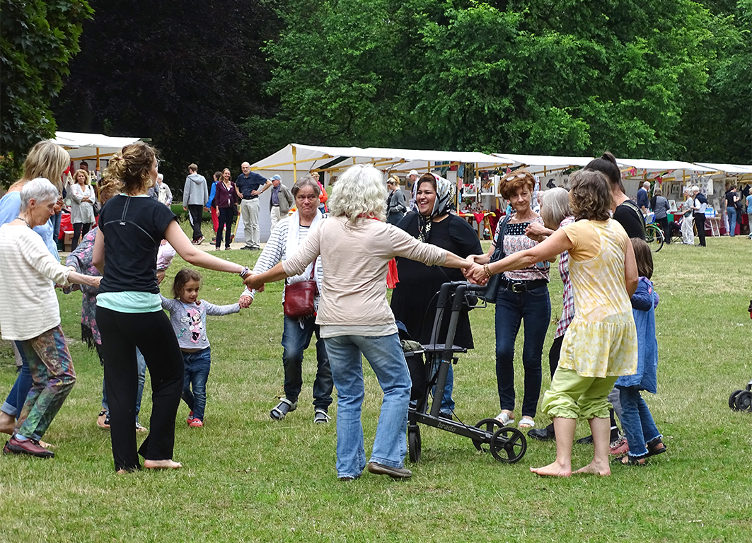 Wer genug von Kunst und Kuchen hatte, fand auf der Wiese ein schönes Programm. Zuerst zeigte die Kreistanzgruppe aus dem Gutshaus ihre Freude an traditionellen internationalen Kreistänzen und vermittelte Spaß an der Musik und an der Bewegung. Zu anderen Klängen und anderen Rhythmen machten ihnen das die Tanzgruppen aus dem KiJuNa nach. Seit vielen Jahren übt Anija mit den Kindern Choreografien ein, die besondere Beachtung bei solchen Gelegenheiten finden. Wer die Kinder über die Jahre kennt, stellt leicht fest, dass aus ehemals kleinen Mädchen nun junge Damen geworden sind und durch neue kleine Mädchen unterstützt werden. Giovanna hat uns im vergangenen Jahr schon mit ihren orientalischen Tänzen fasziniert, was ihr auch diesmal mit Leichtigkeit gelang. Ihre anmutigen Bewegungen zum Tanz mit oder ohne Reif lassen so manchen träumen und genießen. Beim letzten Programmpunkt „Biodanza mit Martina“, gebe ich offen zu, war ich im Vorfeld etwas skeptisch, weil ich es nicht kannte. Biodanza kann man in etwa mit „Tanz des Lebens“ übersetzen und setzt sich aus Musik, Bewegung und Begegnung zusammen. Martina und Natascha warben beim Publikum mitzumachen und als sich eine kleine Gruppe zusammengefunden hatte, begannen die Kreistänze mit viel Schwung und freien Bewegungen. Faszinierend hierbei war die Zusammensetzung der Tanzenden. Mütter mit sehr kleinen Kindern, eine Frau mit ihrer Mutter, die an den Gehwagen gebunden war, Frauen aus Afghanistan – bunter hätte das Bild nicht sein können. Die Freude an der Bewegung reichte bis in die letzte Ecke des Schlossparks und der Spaß an der Begegnung steckte an.